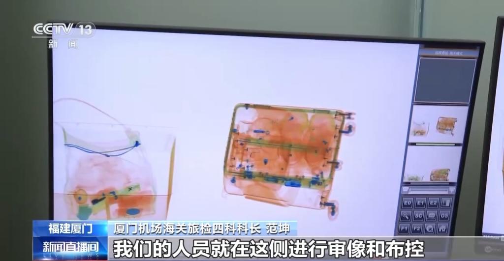 厦门机场海关旅检四科科长 范坤:在办理托运行李的时候,行李的过机图像同步发送给了海关和安检,我们的人员就在这侧进行审像和布控,下达布控指令。在二楼的时候会亮蓝灯,但凡是亮了蓝灯的行李,就会被拖到三楼来进行开包检查。大部分旅客行李是没有问题的,对他来说是无感知的,不等待,也不停留。